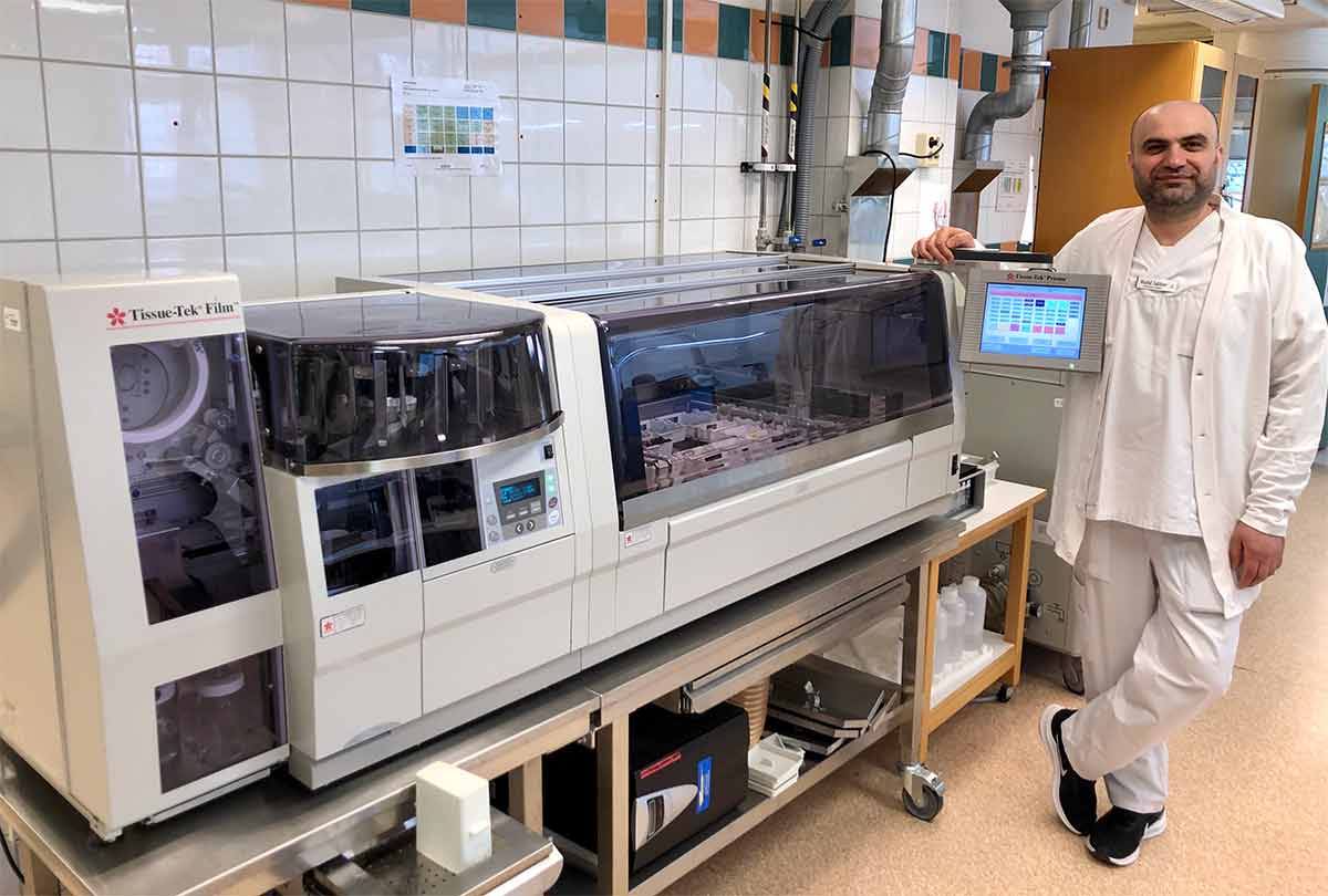 Walid Jabbar, tecnico di laboratorio, accanto al sistema integrato di colorazione e copertura dei vetrini con pellicola Tissue-Tek Prisma® Plus e Tissue-Tek Film®.