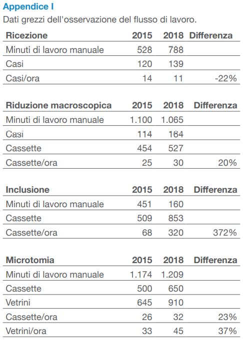 Dai dati grezzi (Appendice I) è stato calcolato il tasso di produttività. Questo parametro è stato ottenuto dividendo la produttività totale di un'unità in una postazione per la quantità totale di tempo manuale impiegato in quella postazione e, a seconda della produzione della postazione. Il valore ottenuto è espresso in casi per ora, cassette per ora o vetrini per ora. I tassi di produttività del primo giorno di studio nel 2015 sono stati messi a confronto con il tasso di produttività del secondo giorno di studio nel 2018.