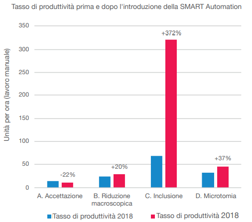 Figura 1. Tasso di produttività 2015 e tasso di produttività 2018, prima e dopo l'implementazione della SMART Automation in ogni stazione e differenza di produttività in percentuale. I valori sono espressi in casi accettati, biocassette in riduzione macroscopica e inclusione, e vetrini in microtomia. L'aumento della produttività maggiore è stato riscontrato alla stazione di inclusione (Figura 1C). Questa postazione ha visto un notevole aumento della produttività, passando da 68 cassette per ora di lavoro manuale a 320, registrando un picco del 372%. Questo incremento è dovuto all'introduzione del Tissue-Tek AutoTEC a120 e del sistema di cassette sezionabili Tissue-Tek® Paraform®.