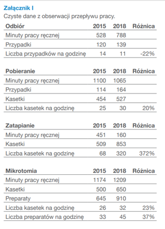 Rysunek 1. Wskaźnik produktywności 2015 (przed) i wskaźnik produktywności 2018 (po) wdrożeniu SMART Automation na każdym stanowisku oraz różnica w produktywności w procentach. Jednostki są wyrażone w przypadkach dla odbioru, kasetkach dla pobierania i zatapiania oraz preparatach dla mikrotomii.