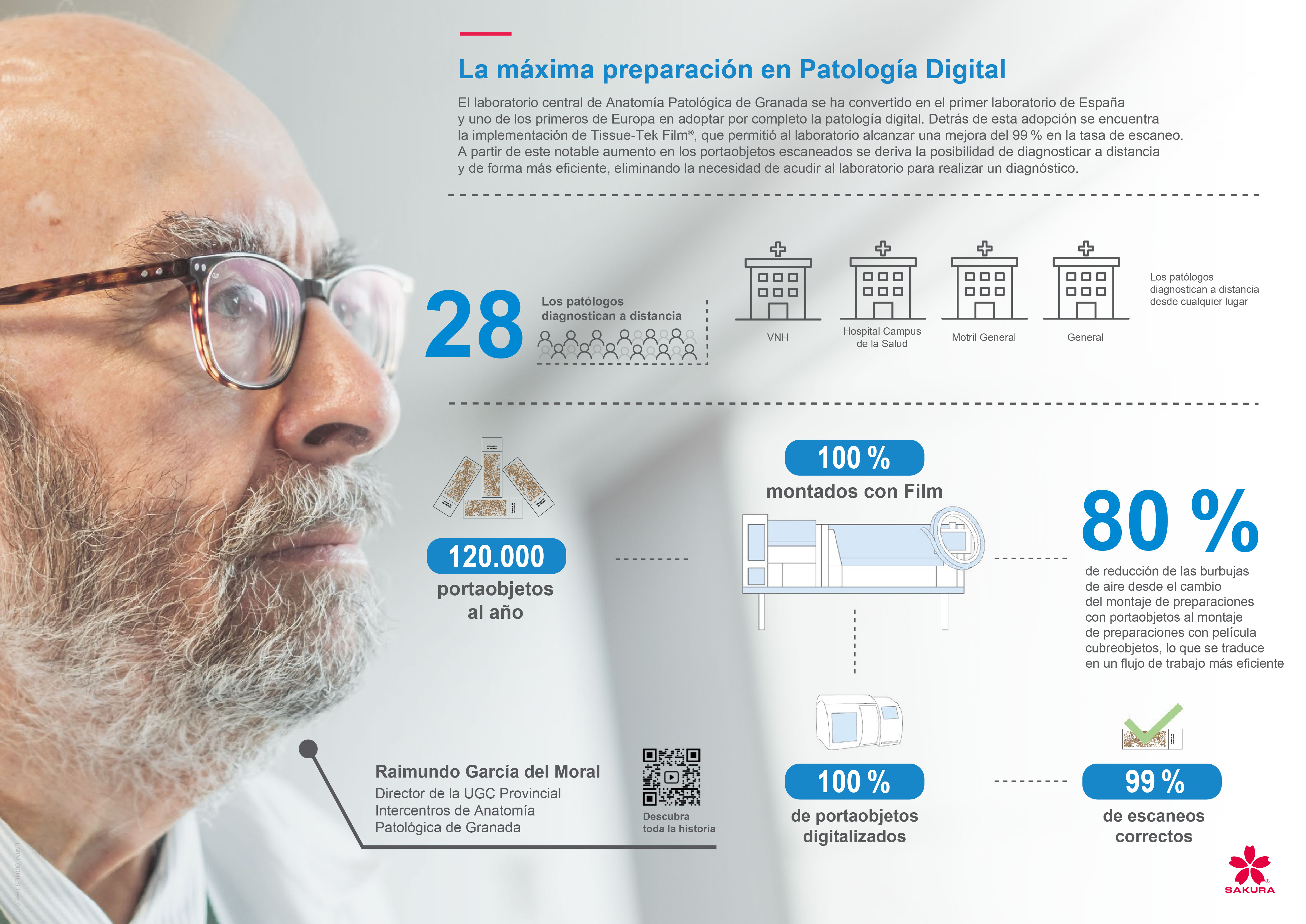 Un paso fundamental en la adopción de la patología digital es la optimización del flujo de trabajo del laboratorio para garantizar que los portaobjetos de vidrio sean adecuados para el escaneo. Un portaobjetos húmedo o sucio puede provocar un funcionamiento incorrecto del escáner y hacer que las imágenes borrosas no sean adecuadas para el diagnóstico. La digitalización correcta de grandes volúmenes de portaobjetos a la primera es fundamental para el diagnóstico digital, y el montaje de preparaciones de vidrio no suele ser suficiente para crear un portaobjetos perfecto y listo para escanear. La introducción de los montadores Tissue-Tek Prisma® Plus y Tissue-Tek Film® en el laboratorio ha permitido que el laboratorio escanee con éxito el 99,9 % de los portaobjetos a la primera porque produce portaobjetos listos para escanear de inmediato, sin burbujas de aire ni un exceso de medio de montaje que pueda interferir con el funcionamiento mecánico del escáner de portaobjetos. Esta excelente tasa de escaneo permite al laboratorio digitalizar toda su carga de casos en el plazo debido. Estas imágenes digitales ahora pueden ponerse a disposición de cualquiera de los patólogos de Granada, en cualquiera de sus centros, lo que garantiza que el caso correcto se pueda enviar inmediatamente al patólogo correcto, en función de su subespecialidad. Esto se traduce en un flujo de trabajo más eficiente para los profesionales del laboratorio, además de un diagnóstico especializado para los pacientes.