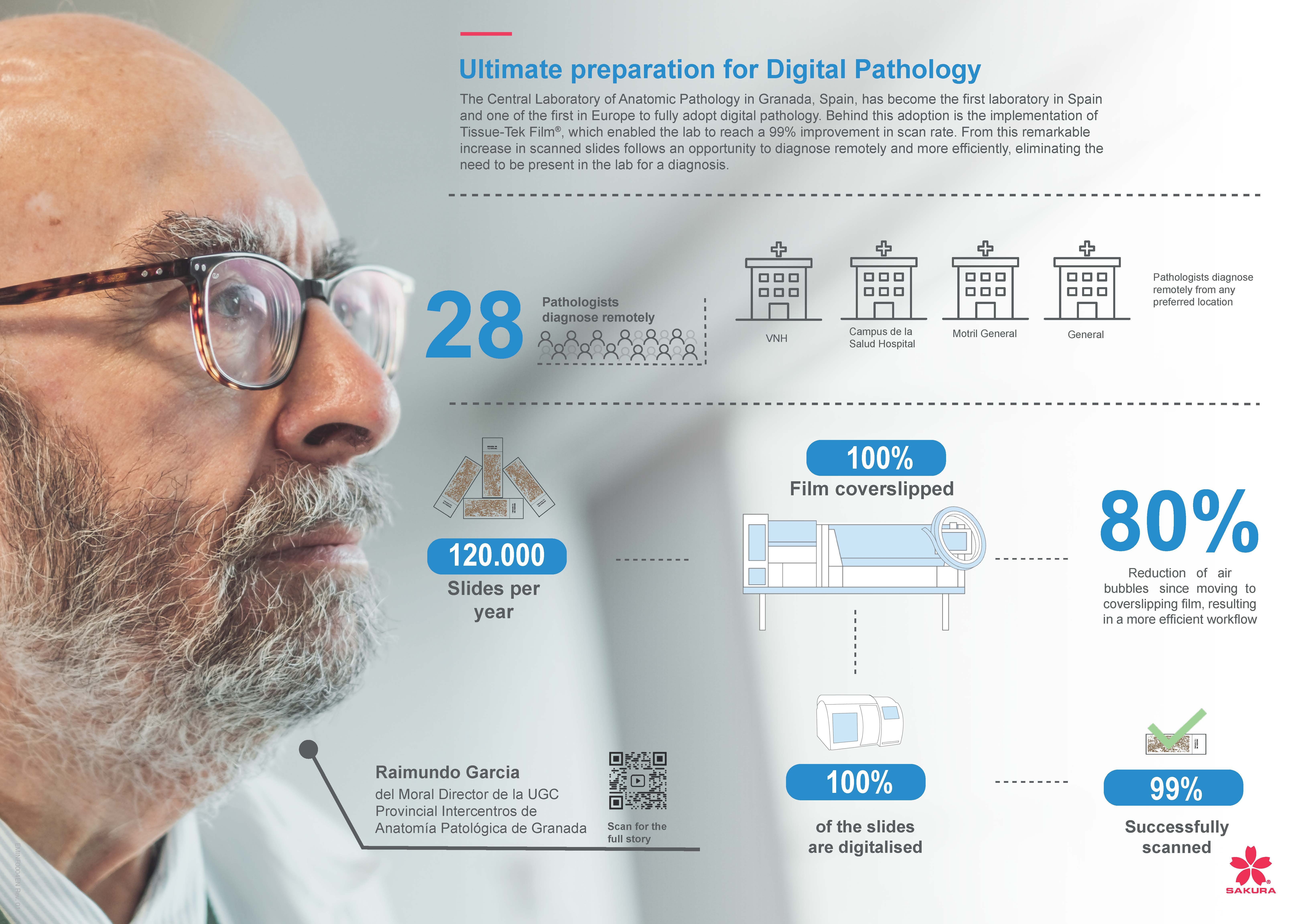 An essential step in the adoption of digital pathology is the optimisation of the laboratory workflow to ensure that glass slides are suitable to be scanned. Wet or dirty slides can cause scanner malfunction and may result in blurry images that are not suitable for diagnosis. Digitising large volumes of slides correctly on the first try is essential for digital diagnosis, and glass coverslipping is often not enough to create a perfect ready-to-scan slide. Introducing the Tissue-Tek Prisma® Plus and Tissue-Tek Film® Coverslipper to the lab has enabled the laboratory to successfully scan 99.9% of slides on the first attempt because it produces slides that are ready to scan immediately, with no air bubbles or excess mounting medium that may interfere with the mechanical functioning of the slide scanner. This exquisite scan rate empowers the lab to digitise its entire caseload in a timely manner. These digital images can now be made available to any of the Granada pathologists anywhere, ensuring that the right case can be sent immediately to the right pathologist according to their subspecialty. This results in a more efficient workflow for the lab professionals, together with a specialised diagnosis for patients.