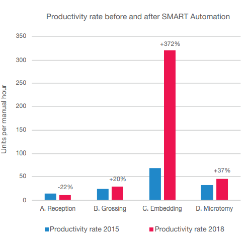 In the recent years, the demand for histopathology services has grown significantly and it continues to grow. The rising cancer cases, increased demand for high-quality results, and increased demand for standardisation have not been in line with the pathology workforce. Therefore, Sakura Finetek designed SMART Automation to automate the laboratory process to enable a continuous flow through the laboratory and to standardise high-quality results. Sakura Finetek conducted a workflow observation in which they measured the rate of productivity at a pathology laboratory both before and after the installation of SMART Automation instruments.