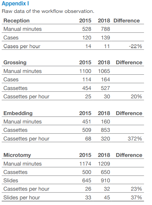 Figure 1. The productivity rate 2015 (before) and productivity rate 2018 (after) implementation of SMART Automation at each station and the difference of productivity in percentage. Units are expressed in cases in reception, cassettes in grossing and embedding, and slides in microtomy.