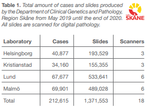 Leading up to 2019, it was recognised that there was a shortage of reporting capacity within the current pathologist team. There was also a need to reduce cancer care lead time. Digital pathology was identified as an option to solve both of these shortfalls. The site in Malmö was active in the implementation and integration of digital pathology that ran throughout 2019 and involved all laboratories.