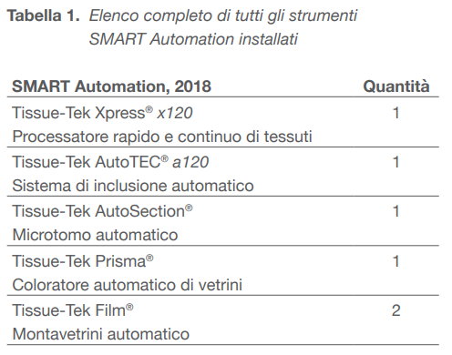 Per mettere a confronto il cambiamento nella produttività prima e dopo l'introduzione della SMART Automation, un team di Sakura Finetek ha osservato due tipici giorni di lavoro nel laboratorio. La prima osservazione si è svolta nel gennaio 2015, prima dell'introduzione della SMART Automation. La seconda, nell'agosto 2018, nove mesi dopo l'implementazione della SMART Automation nel laboratorio. Per garantire una configurazione ottimale del laboratorio è stato messo a disposizione il team di Sakura durante e dopo l'implementazione degli strumenti SMART Automation.